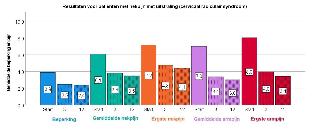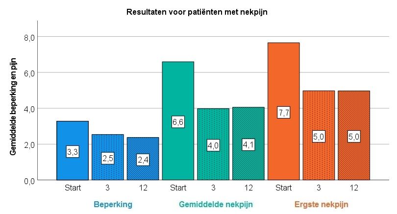 De uitkomsten van zorg voor patiënten met nek- en/of armklachten worden gemeten twee vragenlijsten. Beperking wordt gemeten met de Neck Disability Index en pijn d.m.v. een cijfer van 0 tot 10. Hoe hoger het cijfer, hoe heviger de beperking of pijn. Voor beperking is een vermindering van 1,0 punten klinisch relevant en voor nekpijn is dit 2,0 punten. In het onderstaande staafdiagram zijn de gemiddelde resultaten van 257 patiënten met nekklachten af te lezen voor de ontwikkeling van beperking en nekpijn gedurende een jaar.
